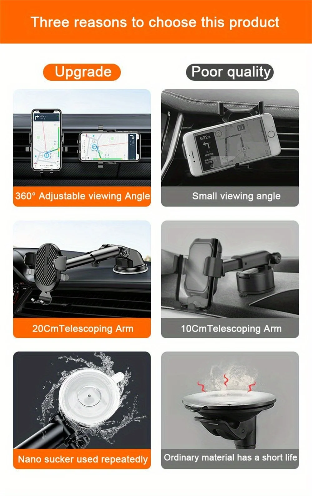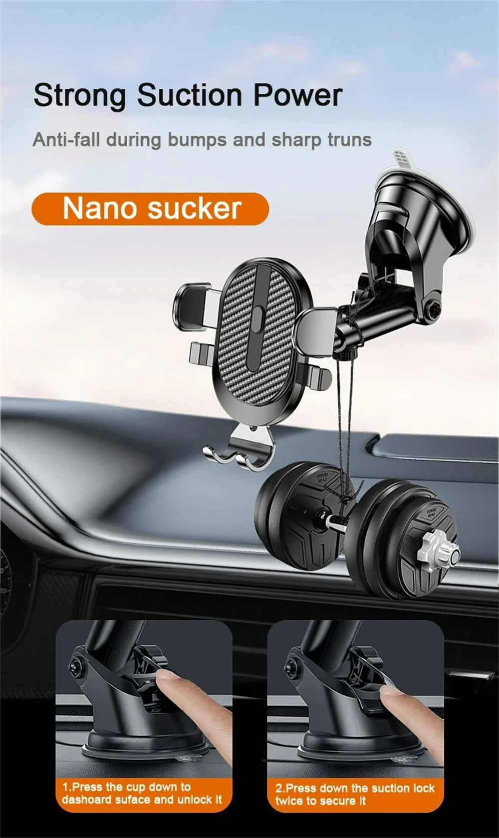 - Premium suction and clamp design secure your phone.
